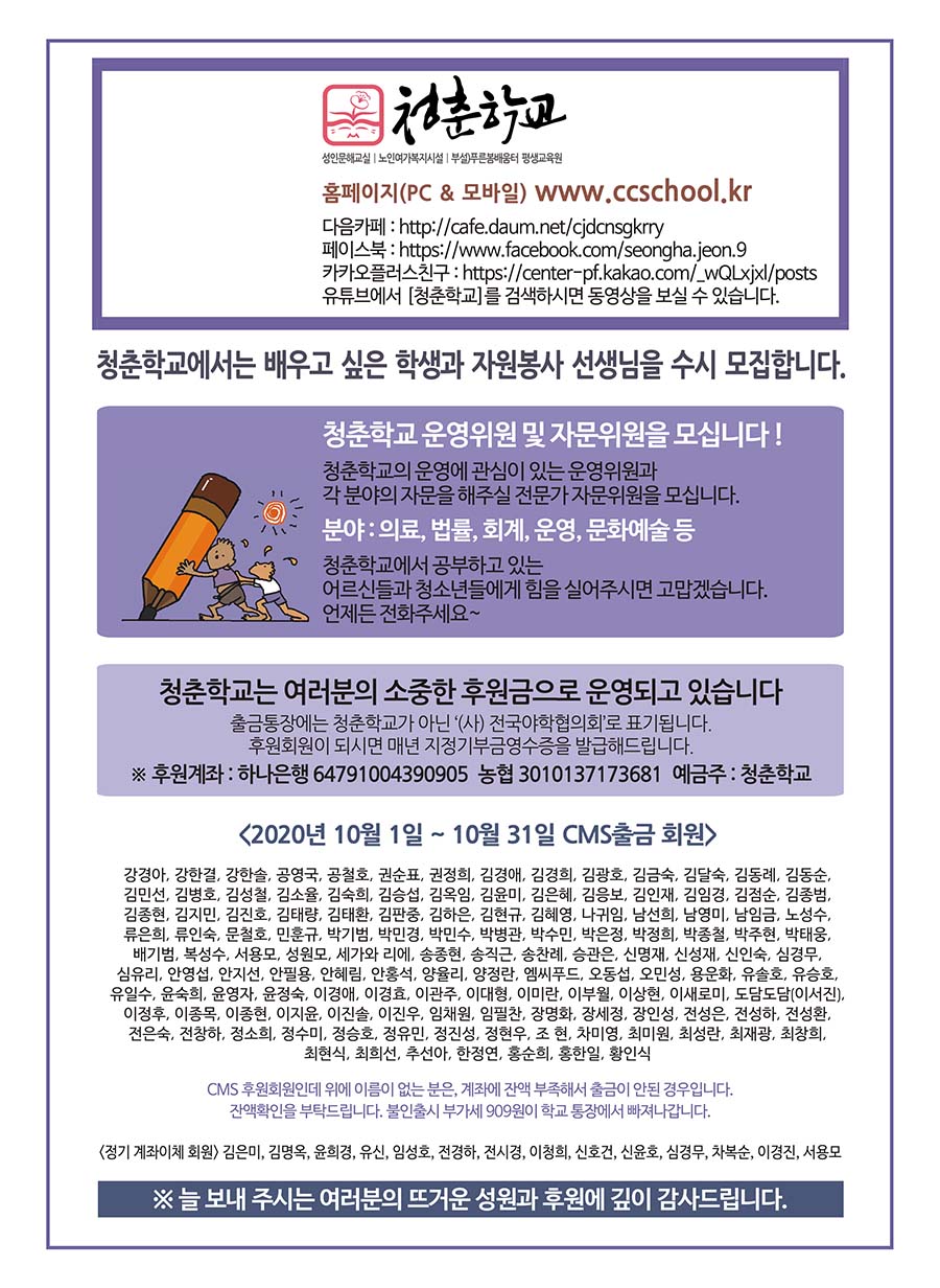청춘학교 2020년 10월 소식지 _ 대전성인문해교실